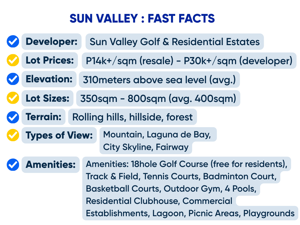 One of our favorite things about Sun Valley is that it can really feel like a getaway. Step outside your home and you’re surrounded by lush trees, open spaces, and that peaceful, quiet vibe that instantly helps you recharge. Depending on the community, you can enjoy sweeping views of the city skyline, mountains, golf courses, or even Laguna de Bay. Each view inspires, relaxes, and lifts your mood. Over the years, we’ve curated an extensive listing of developer and resale lots in this area. So let us know what kind of lot you are looking for and we can match you with something from our Sun Valley inventory map.